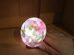 一方、平井ゼミの2年生は別ブースにて「和紙を使ったランプシェード作り」を実施しました。兵庫県の伝統工芸品の和紙を風船に貼り付け、乾かしてから風船を取り除くと和紙のランプシェードが完成します。参加者は思い思いに和紙を貼り付け、出来上がったシェードをスマホの灯りで照らして、和紙の柔らかな光を楽しんでいました。