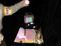 偏光板とセロハンテープを組み合わせ、目に見えない「光の波の重なり」をカラフルな色彩として可視化する不思議な性質を利用。「のびーる!! スライム」は洗たくノリとホウ砂水を混ぜ合わせて作られます。また、それらの仕組みを学生が紙芝居などを用いて丁寧に説明していました。